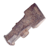 Peça de ferro maciço, com a parte superior em formato oitavado (oito lados), de cantos chanfrados. Sua extremidade superior é plana e levemente achatada nas laterais. No centro há um furo retangular, de cantos arredondados, onde ainda resta parte de um antigo cabo de madeira. A porção inferior é mais larga e vai se afilando, terminando em forma de cunha.