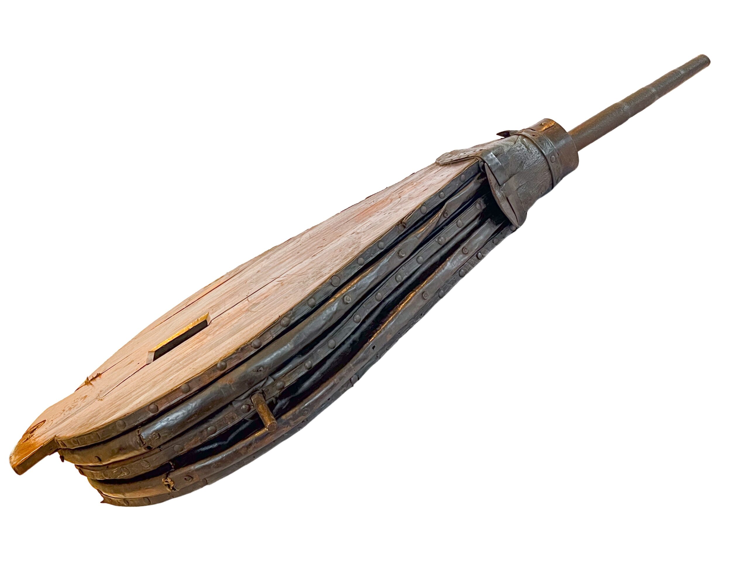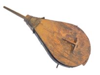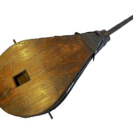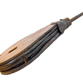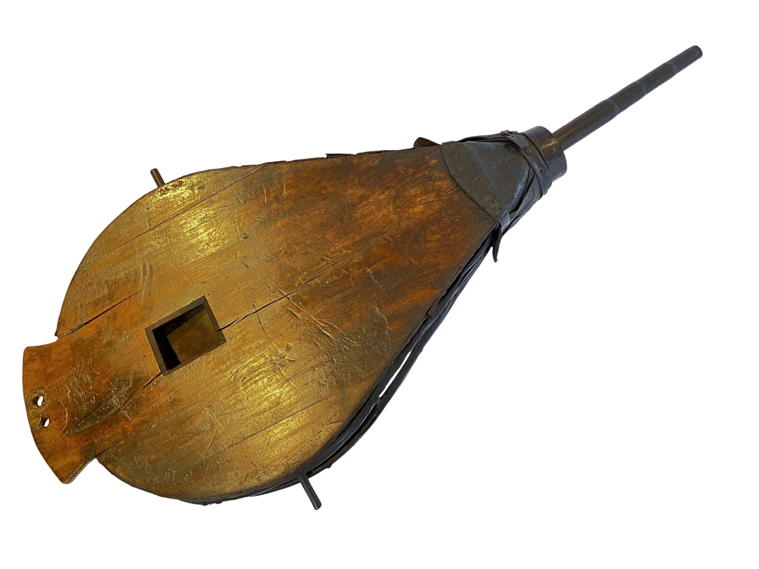 Objeto formado por três grandes pranchas de madeira em formato de pêra. As laterais são revestidas por couro em sanfona, que permite a expansão e a contração do fole, criando dois compartimentos internos separados pela prancha do meio. Na parte superior, há um ressalto curvo e, no centro, um orifício quadrado que funciona como válvula. A saída de ar ocorre por uma boca circular revestida de couro, da qual sai um bico de ferro. Na parte inferior, uma travessa de madeira com recorte em curva serve como apoio. O couro é preso às pranchas com grandes tachas de metal.