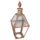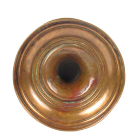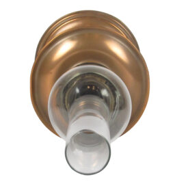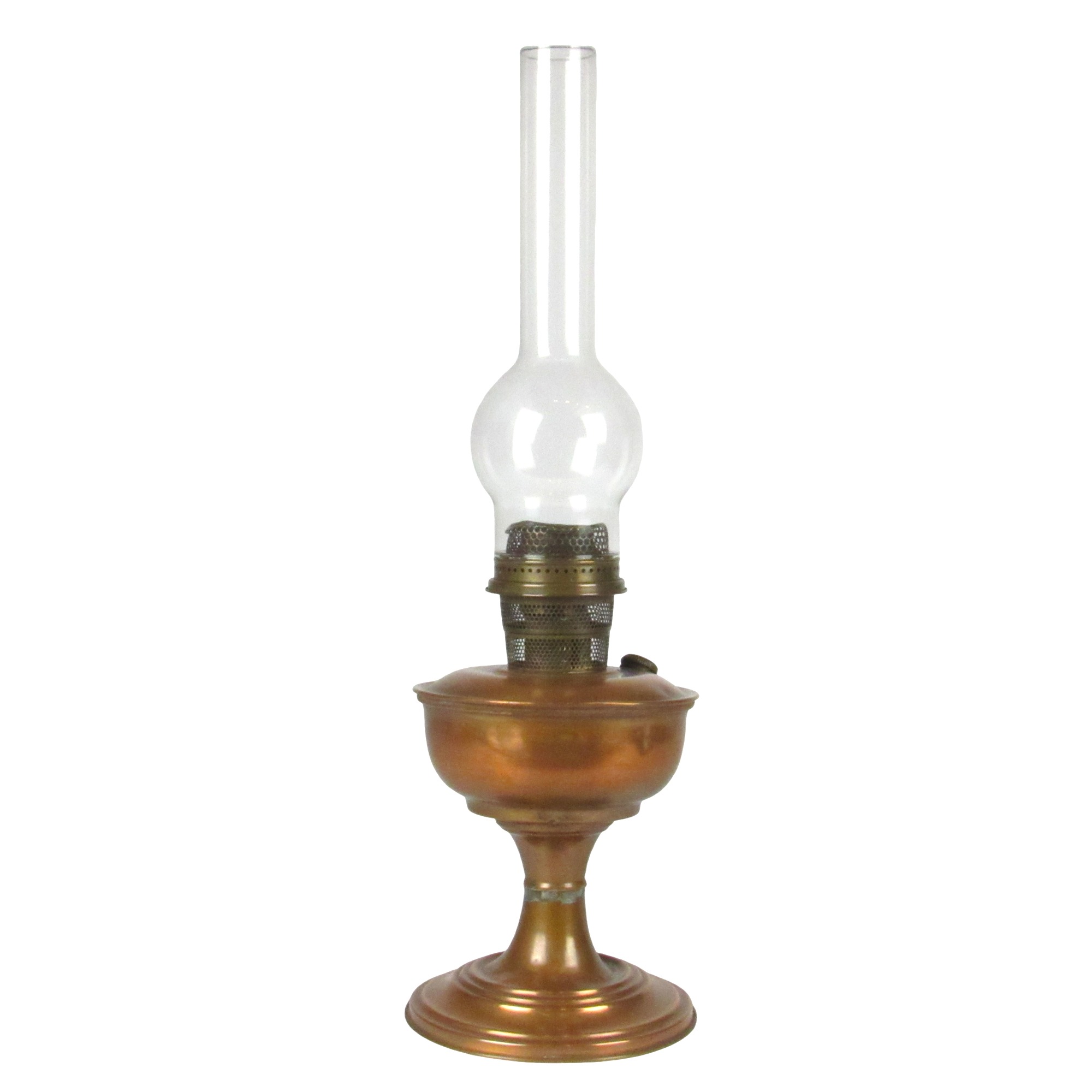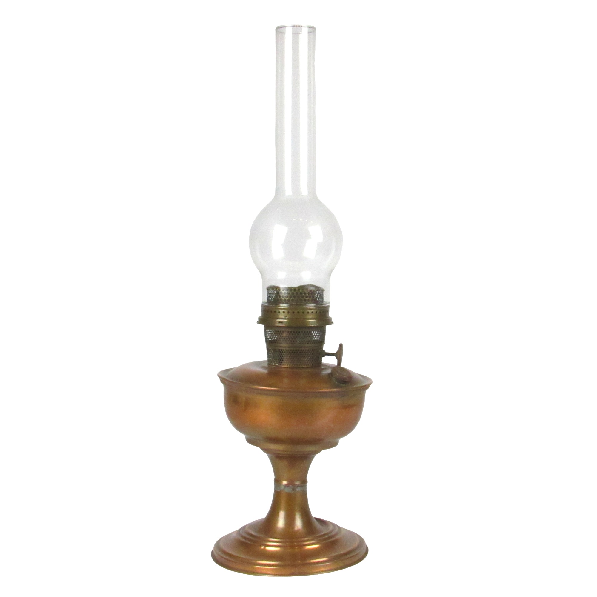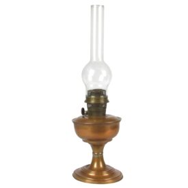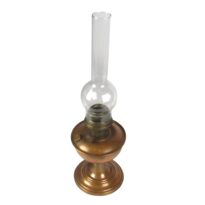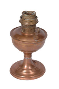 Lampião de metal cobreado, com uma espécie de fogareiro, cilíndrico, revestido por uma tela com orifícios, de metal dourado; ao meio há uma cavidade para a colocação da lâmpada; parte inferior com um pino, para controle da chama; fogareiro situado ao meio da tampa de um recipiente circular, na qual há também um orifício rosqueado, para a colocação do combustível; recipiente sustentado por uma coluna cilíndrica, com um ressalto ao meio, terminada em uma base circular, chata, com os extremos inferior e superior chanfrados.