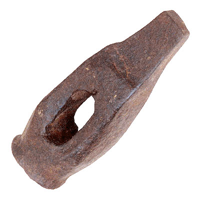 Massa de ferro, com centro mais largo e com um furo achatado e ao meio; extremidade superior terminada em superfície plana, circular, e a inferior, mais estreita, em forma de cunha.