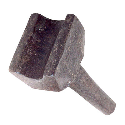 Massa de ferro, com a porção inferior em espiga de secção circular, comprida; porção superior de secção retangular larga, arestas chanfradas, e cuja extremidade apresenta superfície rebaixada em concavidade meia-cana.