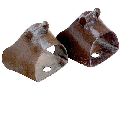 Par de estribos em bronze, com o formato da metade anterior de um calçado, sem o bico; abertura de trás mais larga, em recorte curvo, para encaixe do pé; abertura anterior mais estreita e semicircular; com frisos gravados nas laterais; parte superior de cada