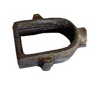 Molde para fundição, em bronze, composta de duas partes encaixáveis entre si, em forma de um aro em meia elipse com corte reto transversal; o extremo em curva é terminado em um ressalto com canaleta meia cana interna, que forma uma boca cilíndrica quando as partes estão juntas; as laterais longitudinais possuem um pequeno ressalto semicircular central com um orifício ao meio em uma parte e um pino na outra, para o encaixe das partes; internamente, são contornadas por um pequeno dente estreito para suporte de um molde que tampa a fôrma.