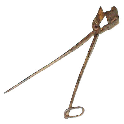 Tenaz de ferro, com duas pernas compridas e retas, tendo presa à extremidade de uma delas uma argola, que serve para manter apertada sua boca; pernas unidas por um eixo extremo que permite seu movimento, seguido de uma boca em duas chapas retas de superfícies planas, sendo uma mais larga, com as laterais dobradas para dentro.