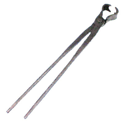 Tenaz de ferro, com duas pernas compridas e retas, sendo uma ligeiramente mais comprida, e mais grossas na porção onde são unidas por um eixo que permite seu movimento, seguido de uma boca curva em dois "C" largos voltados para dentro; quando fechada, a boca forma uma pega circular na parte superior.