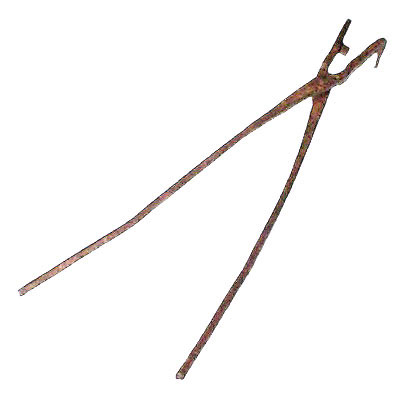 Tenaz de ferro, com duas pernas compridas e retas, unidas por um eixo extremo que permite seu movimento, seguido de uma boca recurvada em ângulo reto, com pequeno recurvo numa das extremidades. Uma das pernas encontra-se torta, devido à uma rachadura.