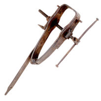 Torno de ferro, formado por duas barras verticais: uma fixa e outra articulada na base por um parafuso. As extremidades superiores terminam em duas garras, que seguram a peça a ser trabalhada. A barra fixa continua para baixo em um rabo cilíndrico e estreito, usado para encaixar o torno em um dos pés da banca. A regulagem da distância entre as garras é feita por um parafuso rosqueado, com um cabeçote cilíndrico atravessado por um manípulo, que facilita o giro. Esse parafuso se encaixa em um canhão-rosca, finalizado em um cabeçote em forma de sino. No meio da barra fixa, há ainda uma braçadeira em formato de “U”.