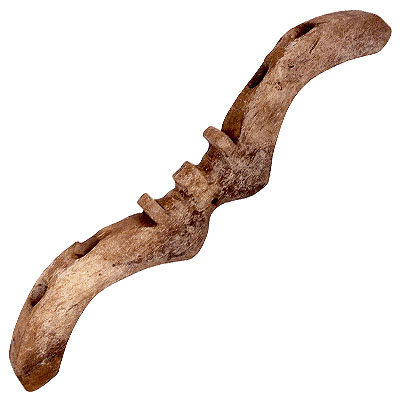 Canga de boi composta por um travessão de arestas arredondadas, recortado em dois arcos ladeando uma parte central, reta e com um recorte sinuoso inferior, com dois furos retangulares enviesados travessando verticalmente o centro de cada arco; apresenta no alto da parte central dois cortes transversais