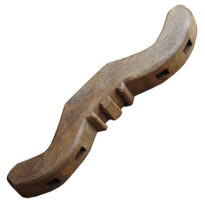 Canga de boi composta por um travessão de arestas arredondadas, recortado em dois arcos ladeando uma parte central reta, com dois furos retangulares e enviesados atravessando verticalmente o centro de cada arco; apresenta no alto da parte central dois cortes transversais.