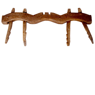 Canga de boi composta por um travessão de arestas arredondadas, recortado em três arcos, sendo que os dos extremos apresentam dois furos, cada um atravessado por uma travessa vertical de linhas sinuosas, com a ponta inferior recortada em dois dentes e com a cabeça superior mais larga, o que as impede de se soltarem do travessão; o arco central apresenta no centro superior dois cortes transversais