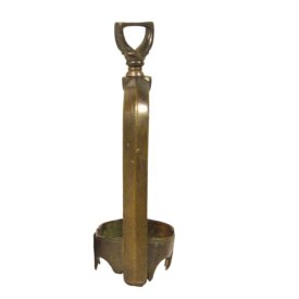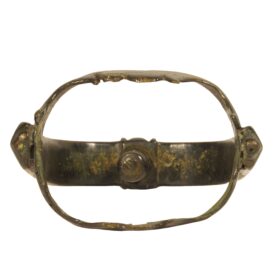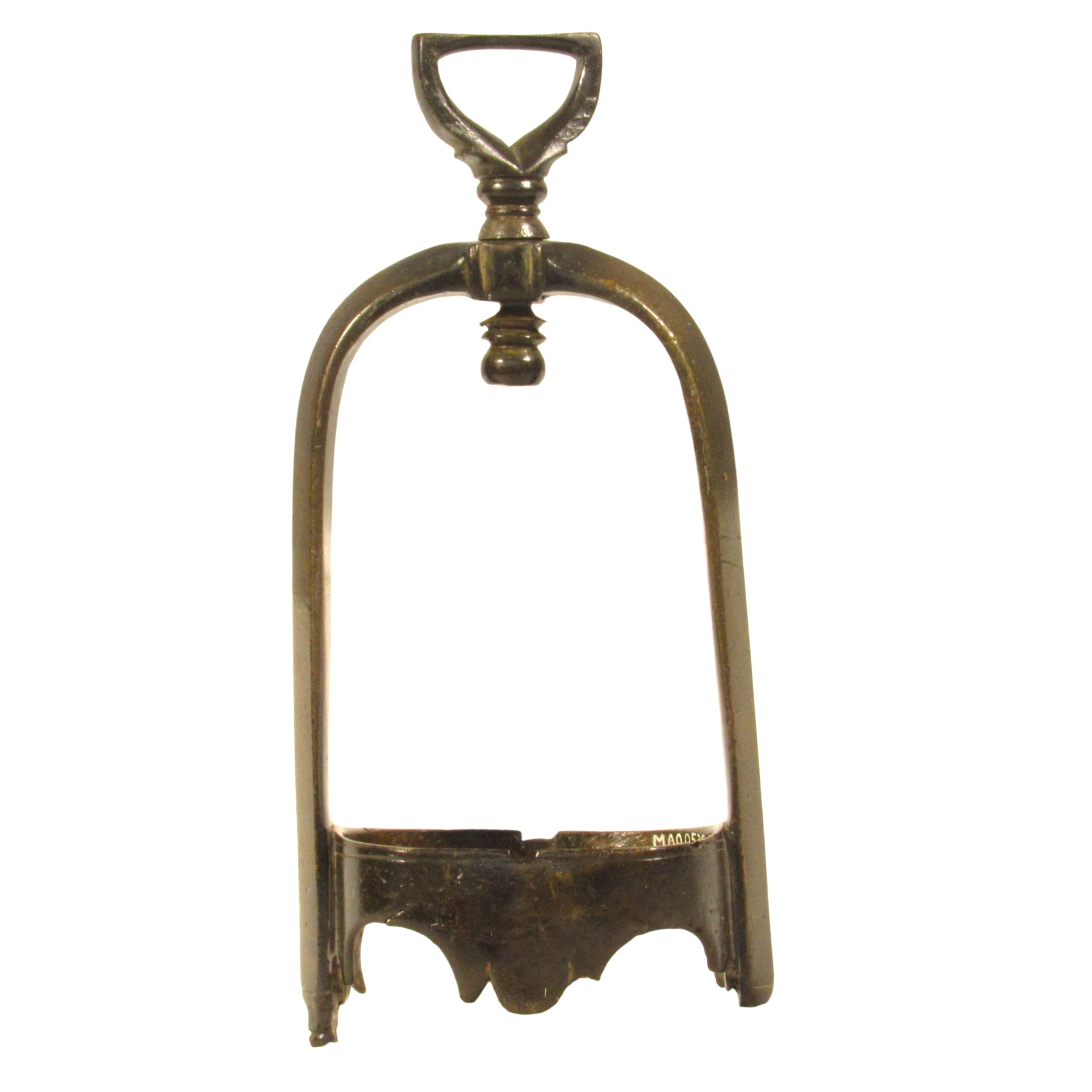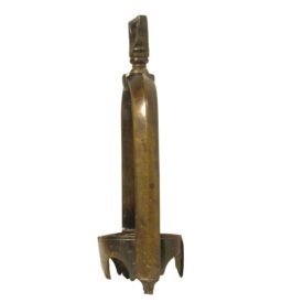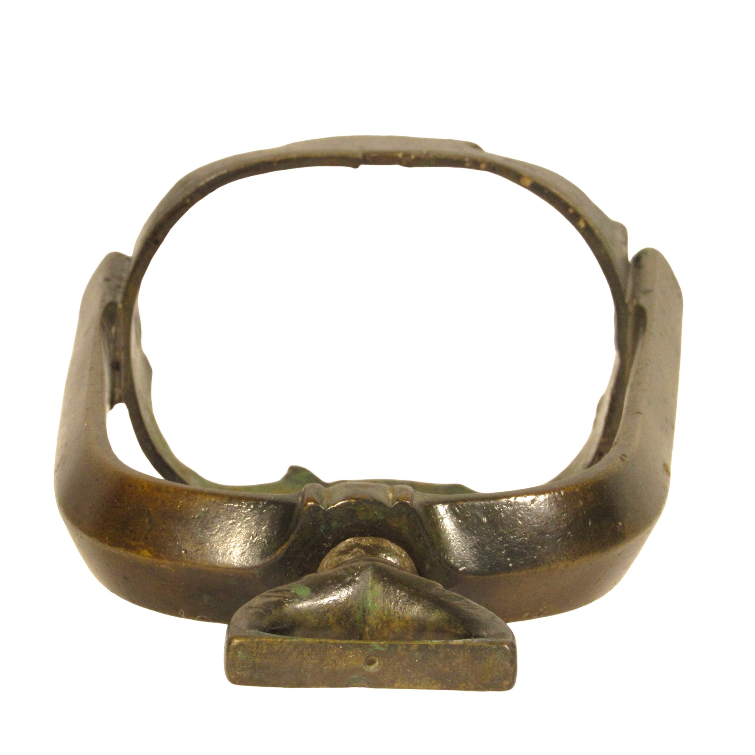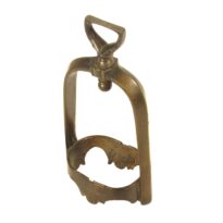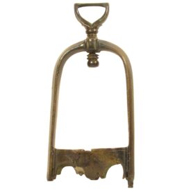 Estribo em bronze, com uma haste longa, achatada e recurvada em forma de "U" invertido, com as faces chanfradas, com um furo reforçado na curva superior e com as extremidades arrematadas inferiormente por um pino em botão dobrado para dentro, de forma a suportar a parte inferior, onde se apóia o pé, esta em forma de aro achatado e ovulado, frisado superiormente e com a porção inferior recortada em curvas e contra-curvas; superiormente é guarnecido por uma alça móvel vazada em triângulo, para a amarração