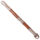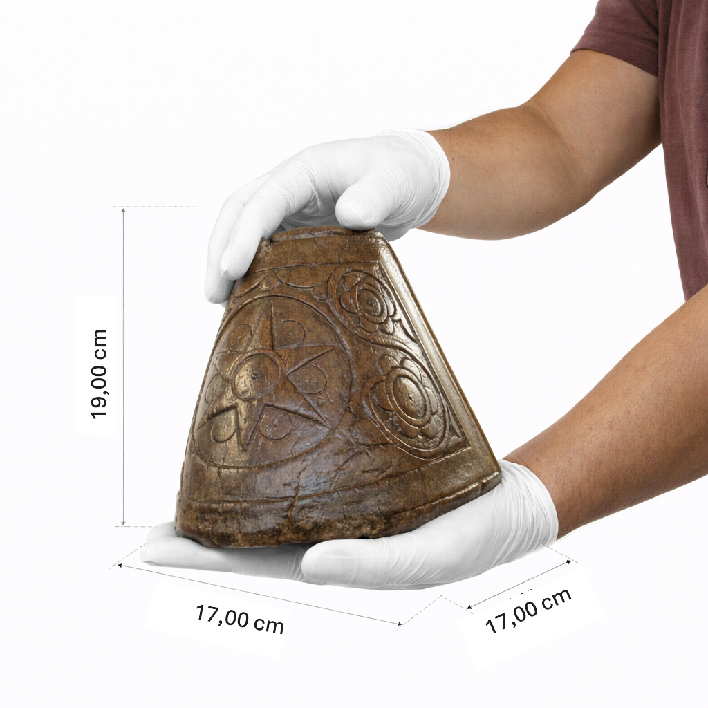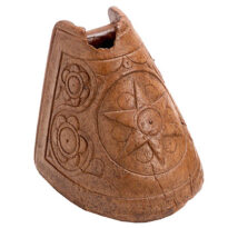 Estribo feito de madeira entalhada, com formato que lembra um casco de cavalo. A base é reta, e a parte da frente é arredondada. A parte externa é decorada com desenhos de folhas e plantas (fitomorfos), com uma grande estrela entalhada no centro, tudo contornado por linhas em relevo (frisos). Na parte de cima, há uma abertura e um eixo na parte de trás, por onde se amarra o loro (tira de couro que prende o estribo à sela). Na parte da frente, embaixo, há um pequeno furo.