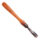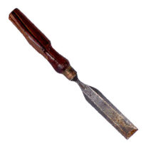 A peça é formada por um cabo de madeira e uma lâmina de metal. O cabo é marrom escuro, com partes mais claras onde a madeira está desgastada pelo uso. Seu formato é anatômico, com cortes que ajudam a segurar melhor. A lâmina, presa na ponta do cabo, é de metal e tem algumas manchas escuras e sinais de ferrugem. Ela é comprida, fina e achatada, afinando um pouco até a ponta, que termina com uma borda reta.