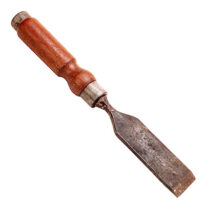 Formão com lâmina larga e a parte superior estreita, cabo de madeira, cilíndrico, com torneado inferior, arruelas lisas de metal nas partes superior e inferior, e envernizado.