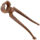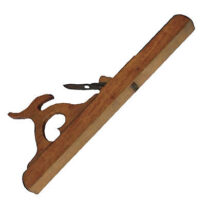 Peça feita de madeira maciça envernizada, em formato de caixa comprida e retangular. As extremidades de cima são arredondadas e os cantos são levemente cortados (chanfrados). Na parte de trás, há uma alça vazada com curvas e contra-curvas, e no topo dessa alça, um apoio em forma de “T”, preso com dois parafusos. A base é reta, e no centro da peça há uma cavidade larga e inclinada, onde ficam encaixados o ferro de corte e sua capa. Eles são fixados por uma cunha de madeira com formato triangular.