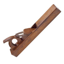 Caixa de madeira envernizada, em formato retangular alongado (paralelepípedo), de tamanho médio. Na parte de trás, há um punho (pega) vazado, com curvas, por onde se segura a ferramenta. No centro da peça, existe uma abertura inclinada onde ficam encaixados a lâmina de corte (ferro cortante) e sua capa, ambos fixados por uma cunha de madeira.