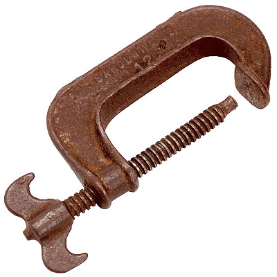 Grampo composto de uma haste dobrada em "C", de secção achatada e com a borda interna mais larga; um dos extremos termina em uma pequena superfície plana e o outro em um parafuso comprido com a cabeça em borboleta invertida.