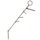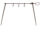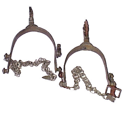 Par de esporas em formato de "U". Cada espora tem dois botões lisos nas extremidades. Em um dos botões está presa uma haste curta e móvel com uma fivela. No outro botão há correntes feitas de elos circulares, com fechos para prender. Na parte do meio de cada espora, há uma haste curva decorada com linhas em relevo, como estrias e frisos em forma de cordão.
