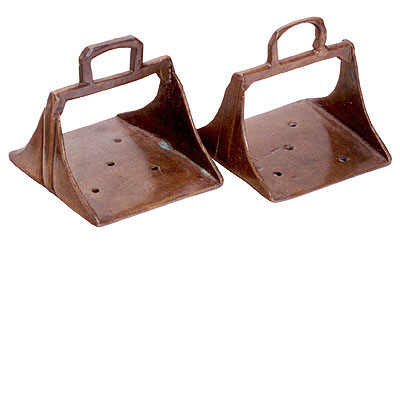 Par de estribos de bronze, com as partes inferiores, onde se apóiam os pés, retangulares e planas, com cinco pequenos orifícios dispostos em "X" em cada um; fechados lateralmente em duas partes recortadas em triângulos de catetos abaulados para dentro, nas quais se funde externamente uma haste em "C" reto, em cuja porção central, que forma a parte superior, existe uma alça retangular, para a amarração do loro.