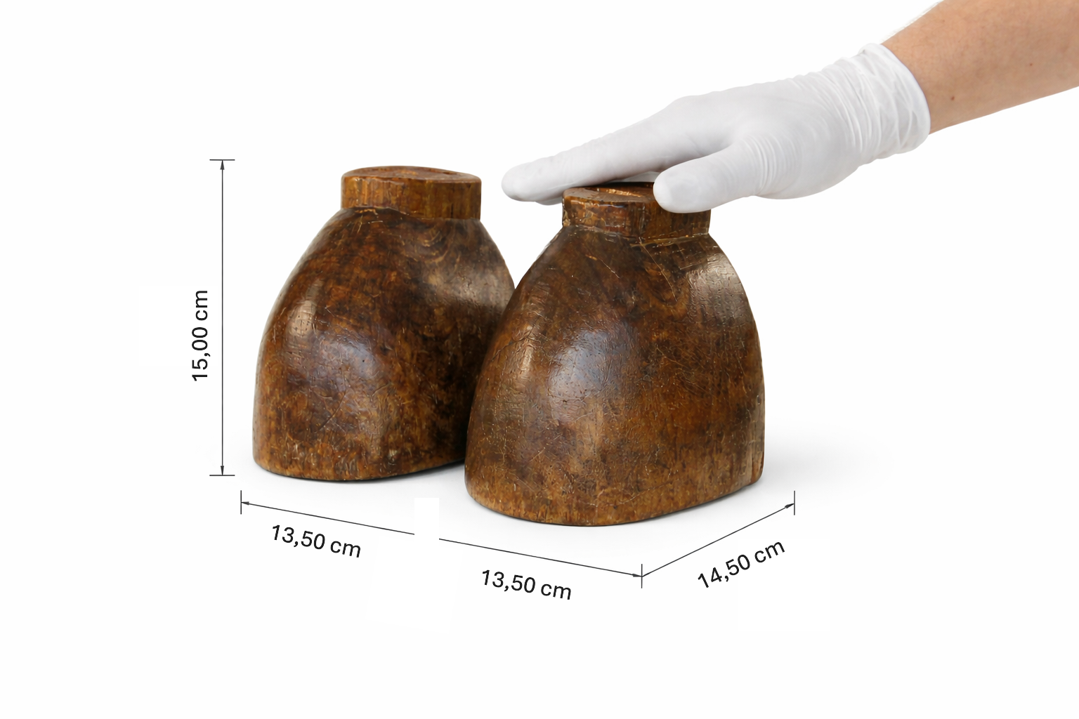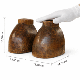 Par de estribos, com cada pé entalhado em peça única de madeira na forma de um casco de cavalo, envernizados, ocos em seu interior; superfície plana interior onde se apóia o pé; ressalto externo superior com dois furos retangulares, para a amarração do loro.