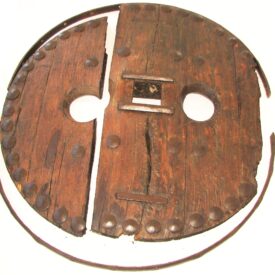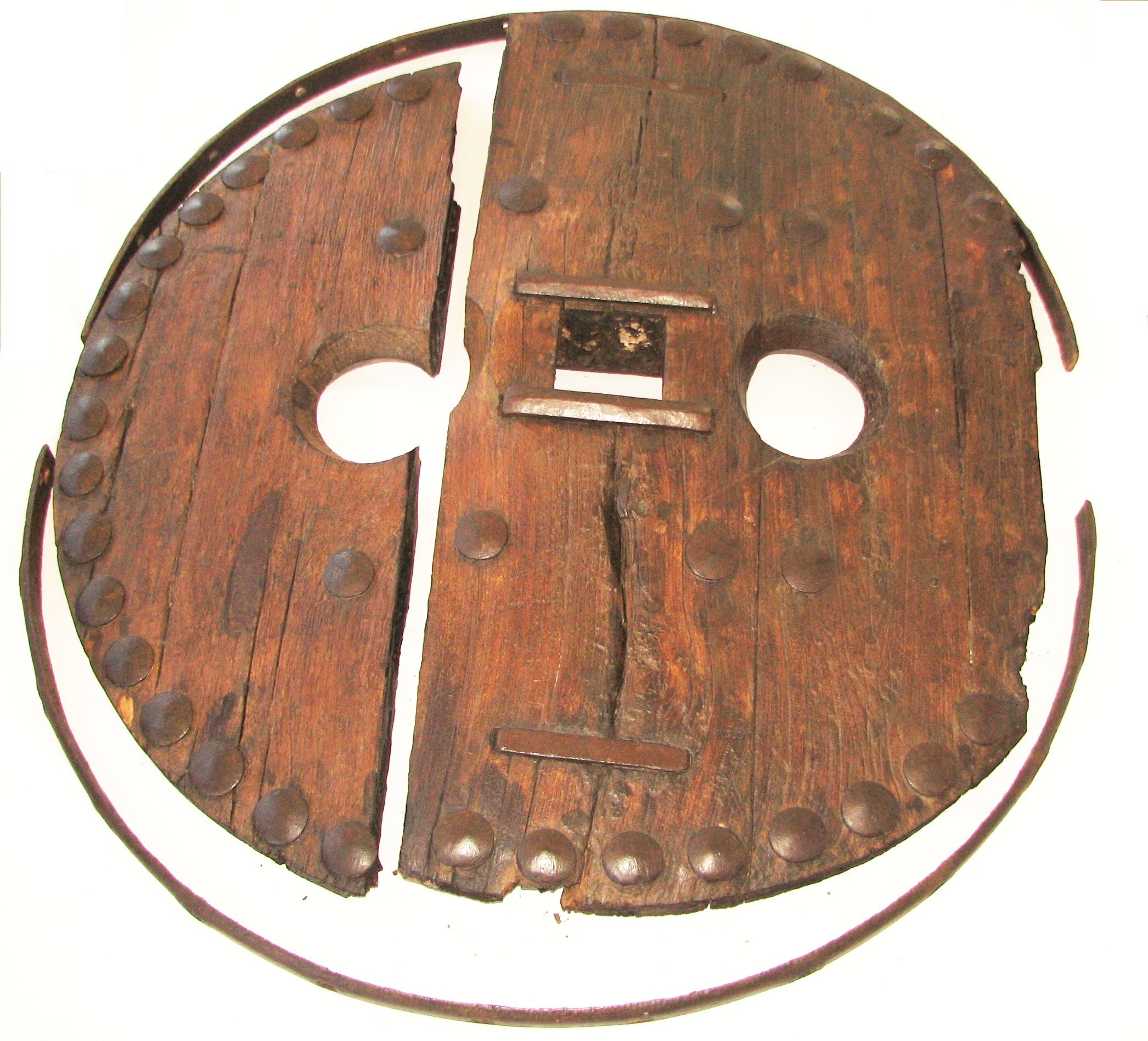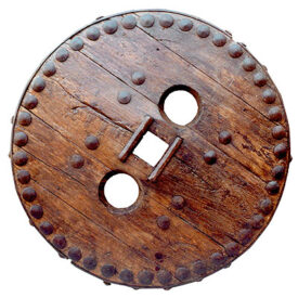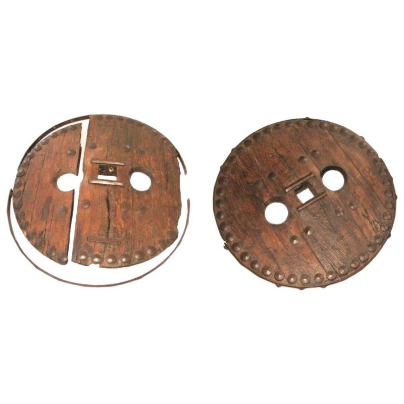 Par de rodas de carro de boi feitas com tábuas de madeira unidas. Ambas mostram sinais de uso e envelhecimento, com a madeira escurecida, desgastada e com os veios aparentes. À esquerda, a primeira roda está quebrada em duas partes, com uma abertura irregular no centro, na posição vertical. Ela tem dois furos redondos, sendo que a parte quebrada passa por um desses furos. Entre eles, há também um furo quadrado no centro da roda. Um aro de metal, dividido em duas metades, fazia parte da borda inferior da roda, mas está separado. À direita, a segunda roda está inteira e montada. Tem os mesmos dois furos redondos e um furo quadrado central, posicionados como na primeira roda. Na borda externa, há uma fileira de pinos ou rebites de metal, distribuídos de forma regular.