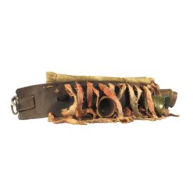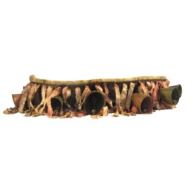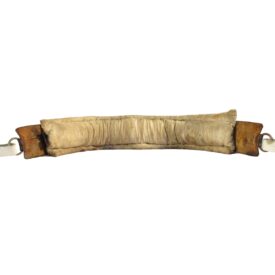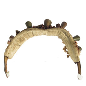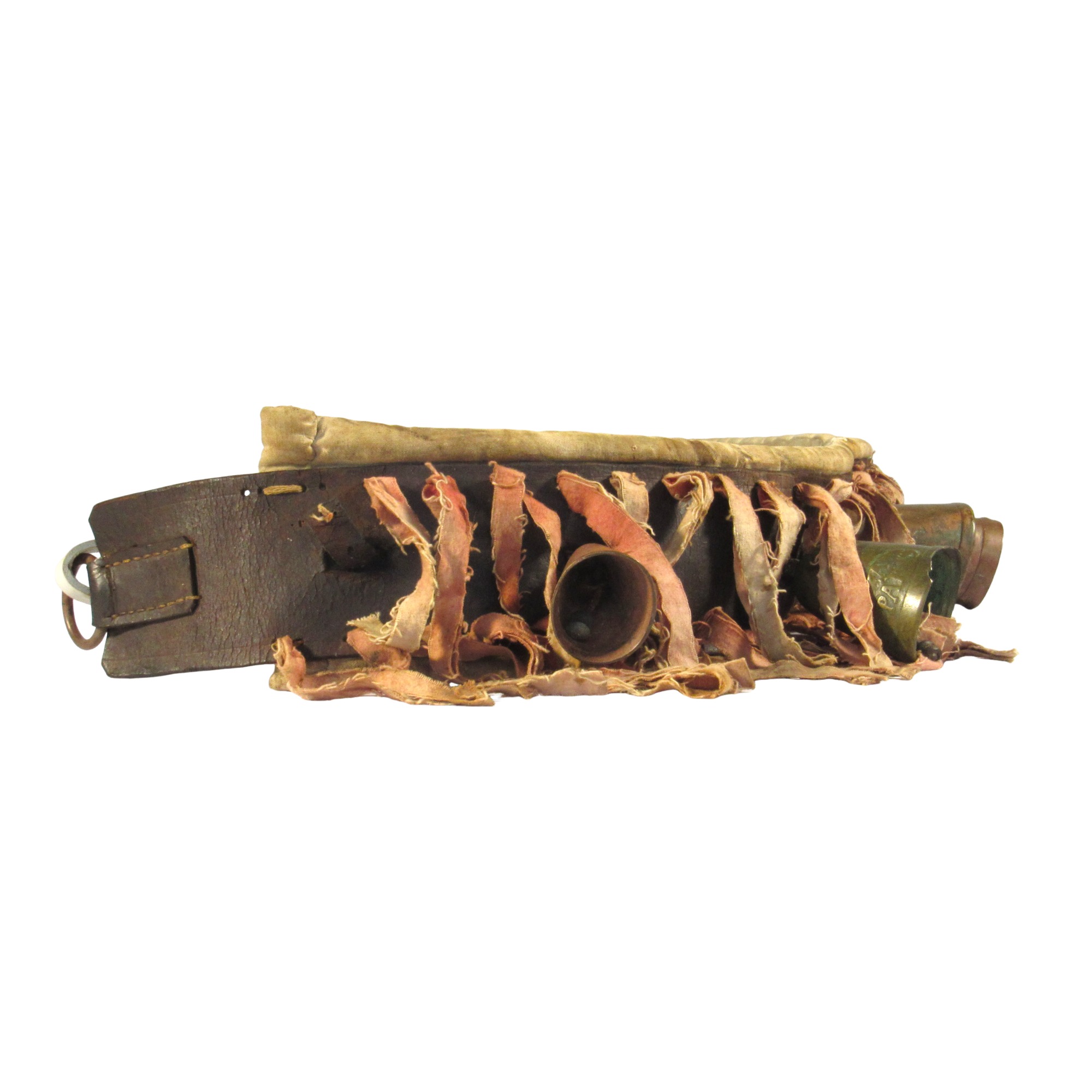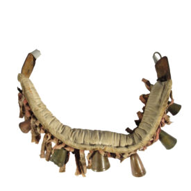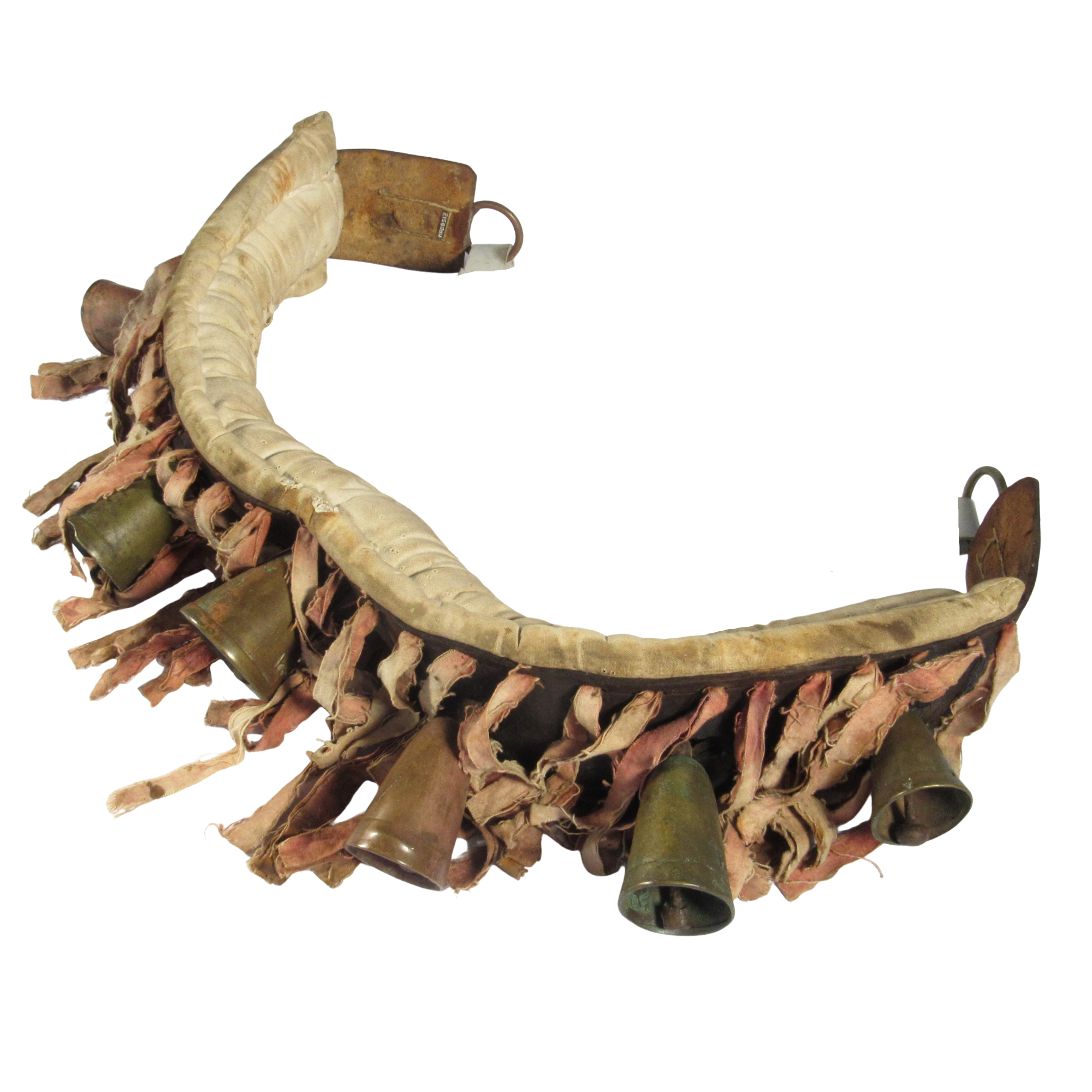 Peitoral com cincerros. Grande coleira em tecido acolchoado e estofado por paina, com um dos lados revestido por uma tira retangular de couro, com argolas de metal nos extremos; tem presas em sua extensão seis sinetas de forma cônica, algumas em bronze e outras em cobre fundidos, com badalos de ferro, levemente achatadas e em tamanhos diferentes, o que lhes confere diferentes tons sonoros; a peça é enfeitada por fitas de tecido vermelho em toda sua extensão.