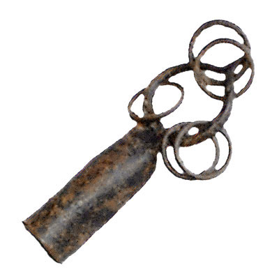 Peça de ferro com uma ponta em forma de aro redondo, pontudo e com um buraco no meio, onde estão presas cinco argolas de ferro. A parte de baixo tem um formato curvo, parecida com uma meia-lua, e é fechada na ponta, permitindo que essa peça seja encaixada ou fixada em um cabo de madeira ou outro suporte.