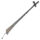 Serra de grande tamanho, com uma lâmina longa de ferro que vai ficando mais fina em direção a uma das pontas. A parte de cima da lâmina é reta, e a de baixo tem dentes em forma de serra, com uma leve curvatura. Na ponta mais fina, há um pino colocado na posição perpendicular à lâmina, com um aro vazado na parte de cima e uma pequena ripa de madeira na parte de trás. Na outra ponta, mais grossa, há uma haste fina e curva, presa à lâmina com um arrebite. Essa haste também tem um aro vazado, onde se encaixa o cabo de madeira da serra.