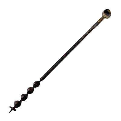 Ferro em forma de cilindro, com a parte de baixo em forma de rosca, com cinco voltas largas e duplas, parecidas com as de um parafuso. A ponta inferior é afiada como um parafuso, o que ajuda a furar e entrar na madeira. A parte de cima da haste é mais grossa e tem um furo, feito para encaixar um cabo e facilitar o uso da ferramenta.