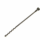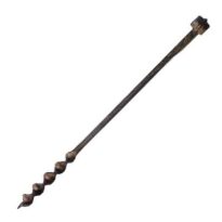 Peça de ferro em formato cilíndrico. A parte de baixo tem uma rosca com seis voltas largas e simples. A ponta inferior é afiada como um parafuso, o que ajuda a guiar e furar a madeira. As duas extremidades são pontiagudas. A extremidade de cima da haste é mais reforçada e tem um furo, feito para encaixar um cabo.