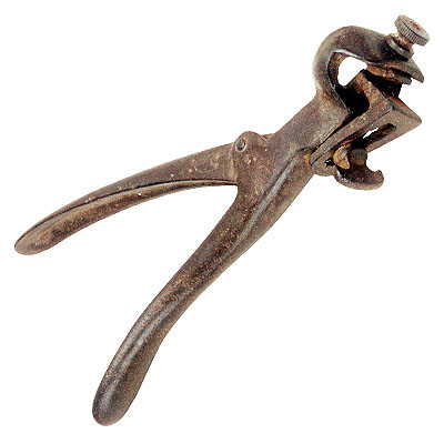 Alicate com hastes (pernas) achatadas e curvadas para trás, ambas na mesma direção. Uma das hastes é inteira e termina em uma boca ovalada, vazada no centro. Na parte da frente dessa boca há uma rosca que movimenta uma pequena base interna. Na parte inferior, o alicate possui uma tarracha que prende um dispositivo regulável. Esse dispositivo funciona quando se pressiona a haste mais curta, centralizando e guiando o movimento de um pino cilíndrico. Esse pino é acionado por uma mola colocada na parte de trás.