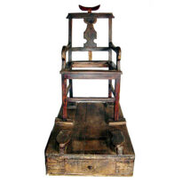 Cadeira de estrutura simples, com pernas retas de formato quadrado, unidas por travessas nas laterais e na frente para dar firmeza. O assento é em forma de trapézio e não possui enchimento no centro.Os braços da cadeira são levemente curvados, com as pontas recortadas em formato arredondado. O encosto é reto, mas inclina-se um pouco para trás e tem uma abertura no meio. Nessa abertura aparece uma peça decorativa recortada em curvas. Por trás desse espaço há um apoio de cabeça para o cliente, feito em forma de meia-lua e preso a uma haste longa. A parte superior da cadeira (cachaço) é reta, com recortes curvos nas extremidades. A cadeira fica apoiada sobre uma base em forma de caixa retangular. Na parte da frente dessa base existe uma pequena gaveta com puxador arredondado. Já na parte superior, há apoios para os pés, recortados no formato adequado.