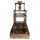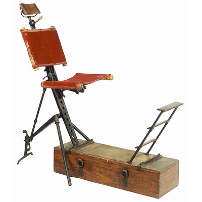 Cadeira de dentista feita em estrutura de ferro, desmontável. A base é formada por um tripé, com um pé traseiro transversal preso por um grande parafuso em forma de borboleta.Do tripé se ergue uma haste de formato retangular, cheia de orifícios quadrados ao longo do seu comprimento. Essa haste é sustentada por uma barra inclinada ligada à base.