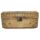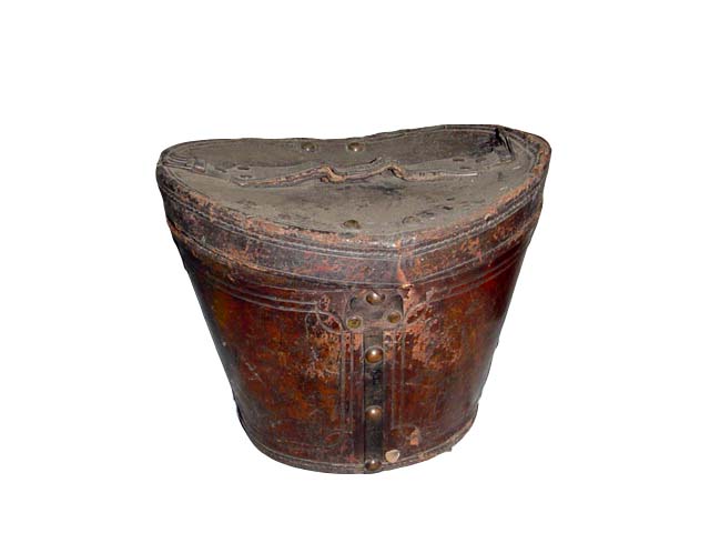 Caixa de formato cônico, levemente achatada, com o corpo decorado por desenhos geométricos gravados e tachões de ferro, além de quatro furos metálicos. A tampa é abaulada, com frisos na borda e uma alça no centro, presa por duas fivelas nas extremidades. Também possui tachões como enfeite. A peça é toda envernizada, e a parte inferior é revestida de papelão e madeira.