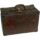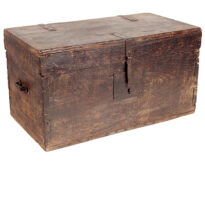 Caixa de madeira em formato retangular, com uma tampa presa por duas dobradiças. Na parte da frente, há uma fechadura quadrada que mantém a tampa fechada. Nas laterais, a caixa tem alças retas para carregar.