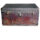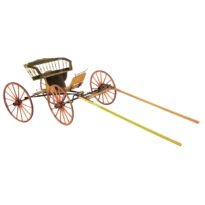 Uma charrete com quatro rodas vermelhas e eixos finos, ligadas por molas que sustentam o assento. O assento é longo, tem laterais arredondadas e é envolvido por um gradil torneado (como uma grade decorativa), pintado de verde. Abaixo, a base é amarela, e o fundo também tem um gradil amarelo. Na parte da frente, há um apoio para os pés, de onde saem duas treliças (estruturas de madeira), que possuem, na parte de trás, uma peça de ferro móvel usada para segurar e direcionar a corda que prende o cavalo.