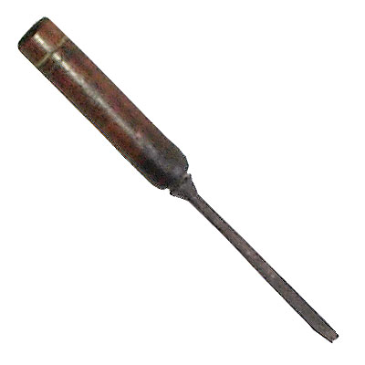Ferramenta com haste de formato quadrado, que fica um pouco mais grossa na parte inferior, onde está o fio cortante (gume). A extremidade superior possui uma pequena parte em formato de oito lados (oitavada), encaixada em um cabo cilíndrico de madeira torneada e envernizada. O cabo tem dois frisos decorativos, um na parte de cima e outro na parte de baixo.