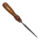 Goiva de lâmina estreita, meia-cana e encurvada, com o corte do lado convexo; cabo em madeira, cônico e liso, com arruela de metal na parte inferior, envernizado.