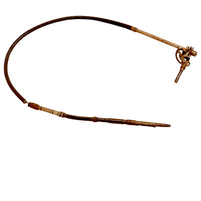 A peça é formada por uma mangueira de borracha preta, bem comprida. Em uma das pontas, há uma haste de aço que termina em um aparelho parecido com um aerógrafo. Esse aparelho conta com um cilindro de metal, que pode ser rosqueado e ajustado, e possui uma pequena polia na parte superior. Na outra ponta da mangueira, há uma haste de aço mais curta, ligada a uma mola comprida. Essa mola termina em um instrumento parecido com uma caneta, cuja parte da frente pode ser rosqueada. Esse instrumento possui duas alças: uma localizada na parte de trás e a outra na parte da frente, para facilitar o manuseio.