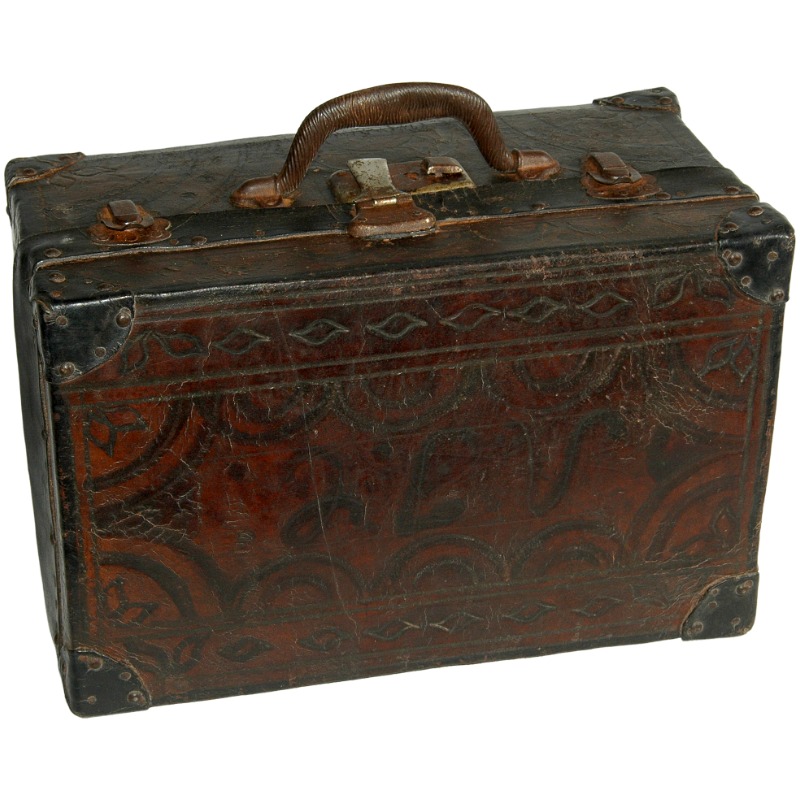 Maleta feita de madeira, coberta com couro. Tem uma fechadura, trancas e uma alça de metal para carregar. Nos quatro cantos, há pedaços extras de couro, presos com tachas e pregos, para deixar mais resistente. Em volta das bordas e no centro da maleta, existem desenhos em relevo de plantas e círculos. Por dentro, a maleta é forrada com tecido.