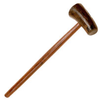 Martelo de chifre, com a cabeça em tronco de cone curvo, com duas praças, tendo ao meio um orifício circular, o "olho", onde se aloja um cabo cilíndrico de madeira, que apresenta o meio ligeiramente mais grosso.