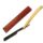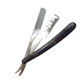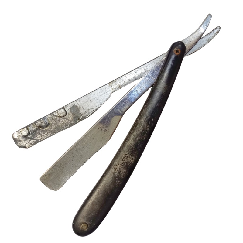 Navalha formada por um cabo e um suporte articulado. O suporte é composto por duas partes que se unem para prender a lâmina e possui um mecanismo dobrável, permitindo que a lâmina seja recolhida para dentro do cabo quando não está em uso. No suporte, há uma inscrição em alto-relevo com os dizeres “PLUMA PAT. REQ.”, parcialmente apagada pela corrosão. O cabo é de plástico preto, com formato alongado e levemente curvado, pensado para oferecer conforto e firmeza ao segurar.