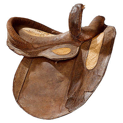 Sela feminina, com armação em madeira revestida por couro trabalhado e estofado, com partes em couro amarelo formando