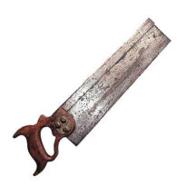 Com lâmina retangular, reforçada superiormente por uma virola longitudinal; cabo em madeira, vazado e recortado em curvas e contra-curvas, envernizado; fixação da lâmina por 3 tarrachas