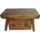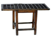Mesa pequena, feita de madeira, com quatro pernas retas de formato quadrado. As pernas são unidas por duas barras de madeira ao longo do comprimento e mais duas barras na largura, para dar firmeza. O tampo da mesa é retangular e tem 48 quadradinhos cavados na superfície, formando uma grade. Em um dos lados mais compridos, há uma borda que tem duas cavidades retangulares em um dos cantos.