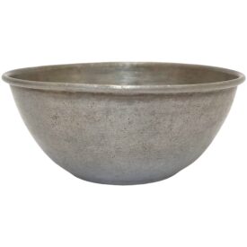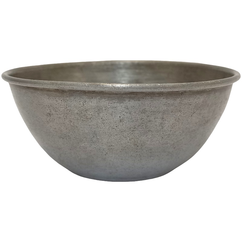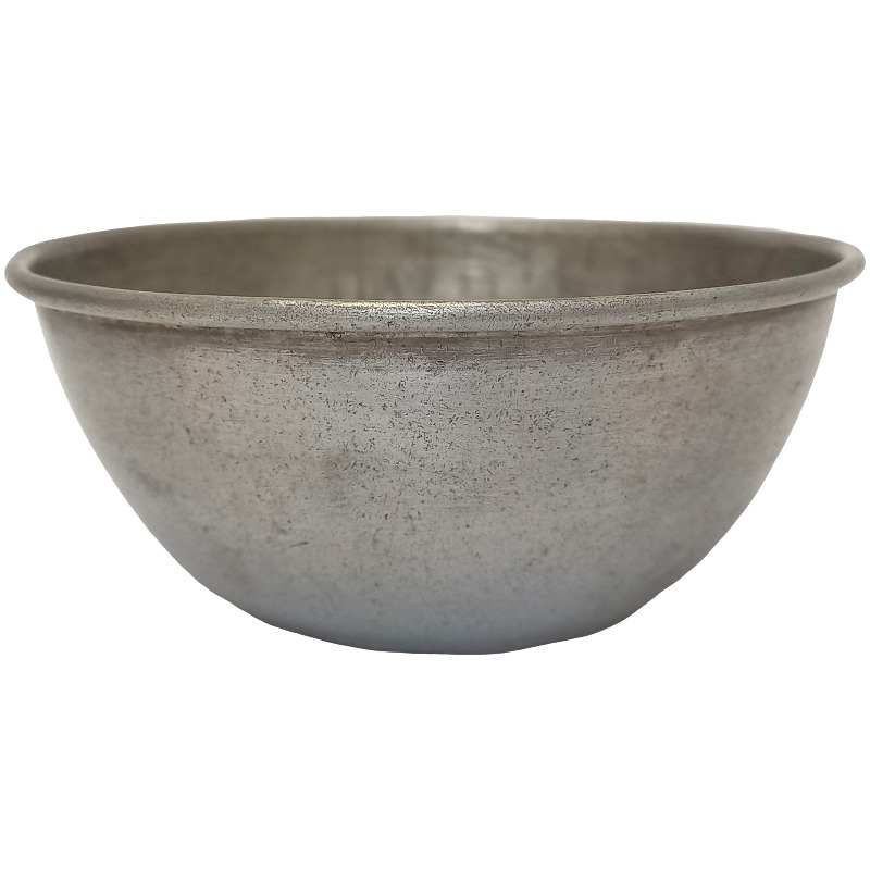 Tigela com formato arredondado e interior côncavo. Sua superfície é lisa, com acabamento metálico prateado fosco. A borda do objeto é circular, apresenta um leve rebord