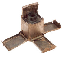 Tinteiro feito para usar com pena ou caneta. Consiste em uma pequena garrafa de vidro em formato retangular, com o gargalo e a boca arredondados e bem destacados no topo. Essa garrafa fica encaixada dentro de uma caixinha também retangular, feita de metal niquelado. A caixinha tem uma base quadrada e uma peça de metal que envolve as laterais compridas da garrafa, formando as paredes. Nas quatro quinas da parte de baixo há pequenos recortes arredondados, onde ficam presas quatro molas – uma em cada lateral. Essas molas também seguram outras quatro chapinhas de metal, uma em cada lado comprido da caixinha. As pontas dessas chapas são dobradas para dentro e têm recortes nos cantos e no meio, com pequenas cavidades feitas para encaixar a tampa por cima. A tampa é quadrada, com um ressalto redondo no meio, onde se apoia o gargalo da garrafa. Ela é presa na parte de trás por um arame que funciona como uma dobradiça, permitindo que a tampa abra e feche com facilidade.