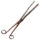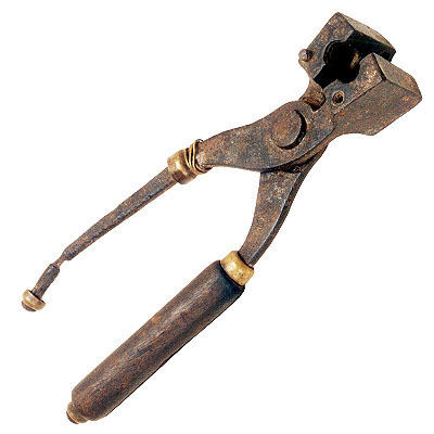 Ferramenta de ferro, parecida com um alicate, com duas “pernas” cobertas por cabos de madeira redondos e lisos, terminados em cima e embaixo por anéis de metal amarelo. As partes da frente dessas pernas são achatadas e levemente curvas, unidas por um pino que forma a articulação da ferramenta. As “bocas” da ferramenta têm formato quadrado e, quando fechadas, formam um pequeno cubo. Por dentro, cada boca tem meia canaleta com rosca (marcação em espiral) na parte mais próxima da ponta; quando as duas metades se juntam, formam um furo redondo com rosca por dentro. Em uma das bocas há um pino, e na outra há um furo onde provavelmente também deveria entrar um pino semelhante.