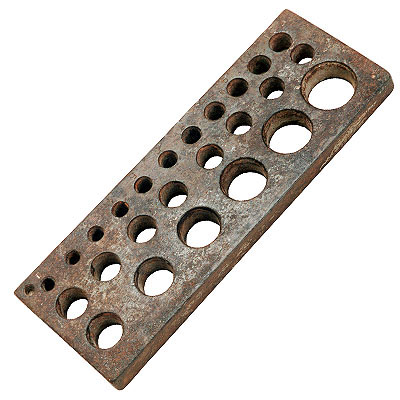 Barra de aço em formato retangular e alongado, de espessura média. Sua parte superior possui 25 orifícios circulares de diferentes tamanhos, distribuídos em três fileiras uma com onze furos, outra com oito e a última com seis. Cada orifício é numerado de 1 a 25, em ordem crescente, do menor para o maior diâmetro.
