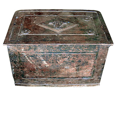 Baú cofre-forte robusto, todo em ferro, com relevo retangular no fundo, almofadas quadradas nas laterais, cada uma com uma grande alça curva, e almofadas retangulares na frente e atrás, sendo a frontal ainda marcada por uma almofada em losango ao centro. Na borda superior frontal há duas linguetas que encaixam nas pequenas alças da tampa. A tampa tem quinas frontais arredondadas e uma almofada retangular central decorada com seis “pontas de diamante” e rosáceas nos cantos, além de uma almofada losangular superior com motivos em forma de coração nas quinas e um buraco de fechadura com tampa, enquadrado por dois triângulos. Na parte interna da tampa existe um falso compartimento que esconde o sistema de trancas, formado por seis dentes que se movimentam quando a chave é introduzida na fechadura externa. Dentro do baú há ainda uma segunda tampa interna, presa por duas dobradiças, com puxador de bronze e um espelho de fechadura recortado em forma de rosácea.